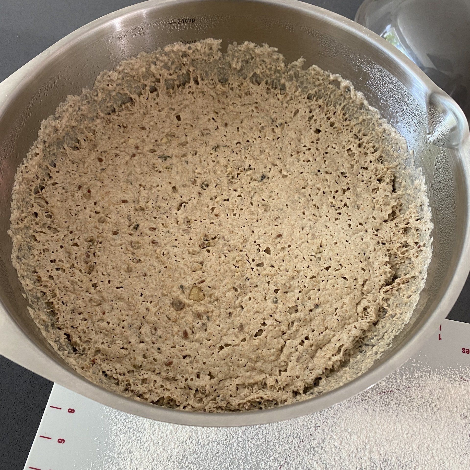 3. Add the remaining ingredients to the middle stainless steel bowl and work into a dough for 5-6 minutes. Pour the dough into the prepared, large stainless steel bowl and let it rise with the lid closed in the oven at 45 degrees C. for 1.5 hours.